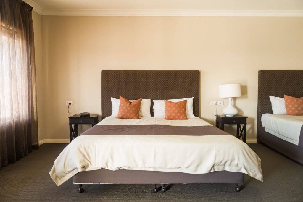 Our Deluxe Courtyard Rooms contain one king bed, one single bed and access to a courtyard.